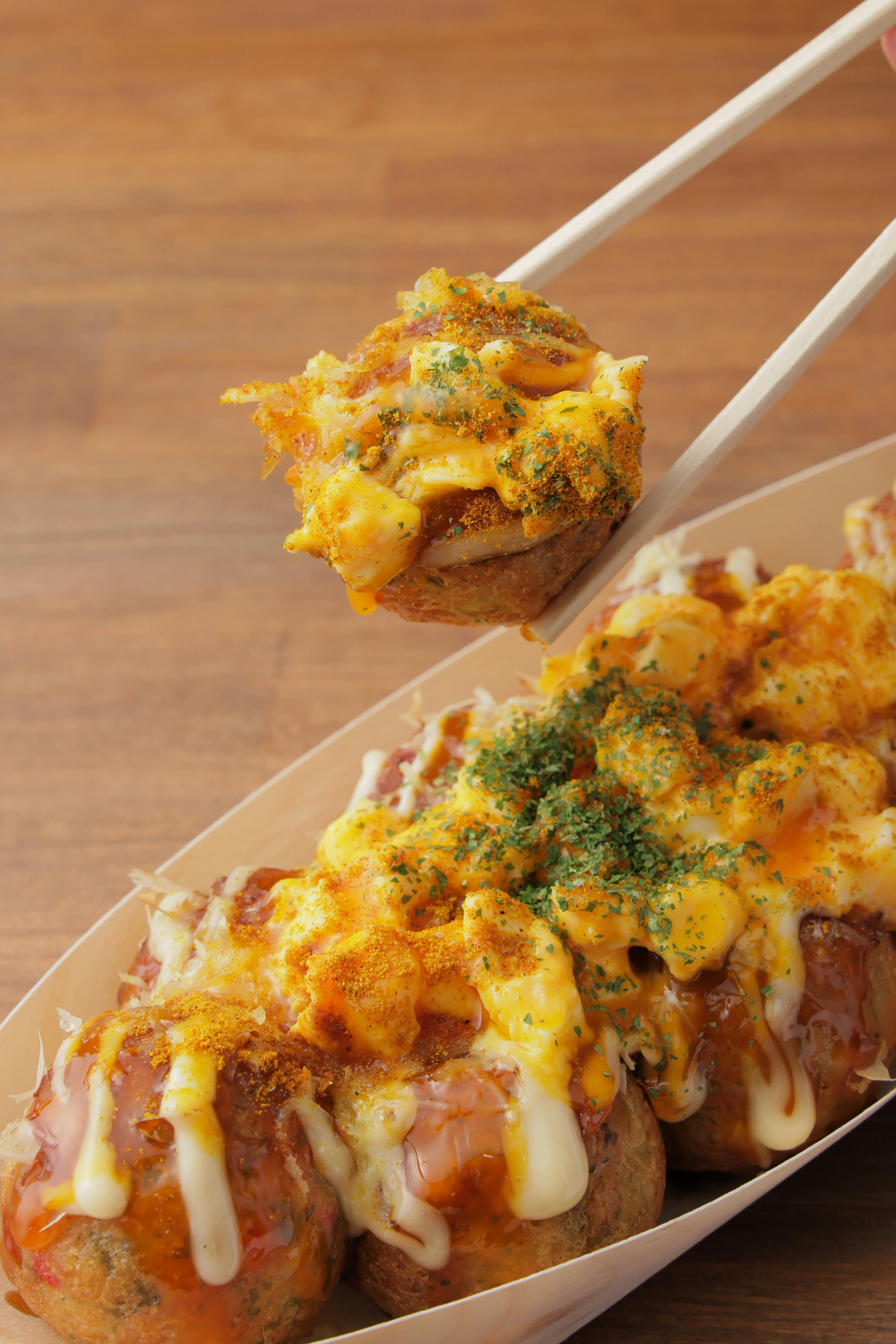 アツアツのたこ焼に、特製「てりやきソース」をかけ、コク深いパルメザンチーズ、とろけるモッツァレラチーズの2種を組み合わせた特製「ミックスチーズ」と店内仕込みの「たまごサラダ」をたっぷりトッピング。さらに、濃厚な「卵黄ソース」を追いがけし、仕上げに今回の主役である約30種のスパイスをブレンドした「カレーパウダー」をふりかけることで、香り高くコク深い、食欲をそそる商品に仕上げました。