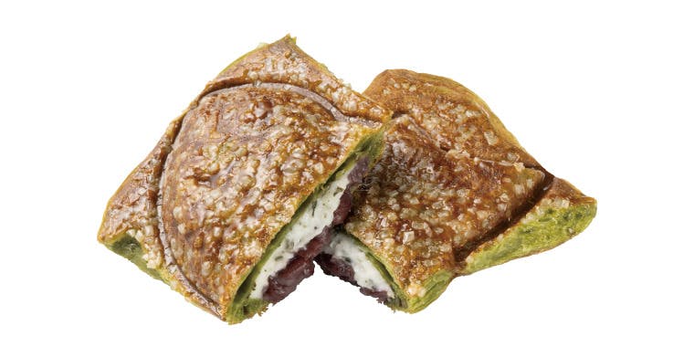 さらに、クロワッサン生地の片面にはざらめをトッピングし、専用の鉄板で両面を一気に焼き上げることで “サクッ” とした食感と、抹茶のほろ苦さとミルクのまろやかさ、餡のやさしい甘みと茶葉が重なり合い、ひと口ごとに奥行きのある味わいをお楽しみいただけます。