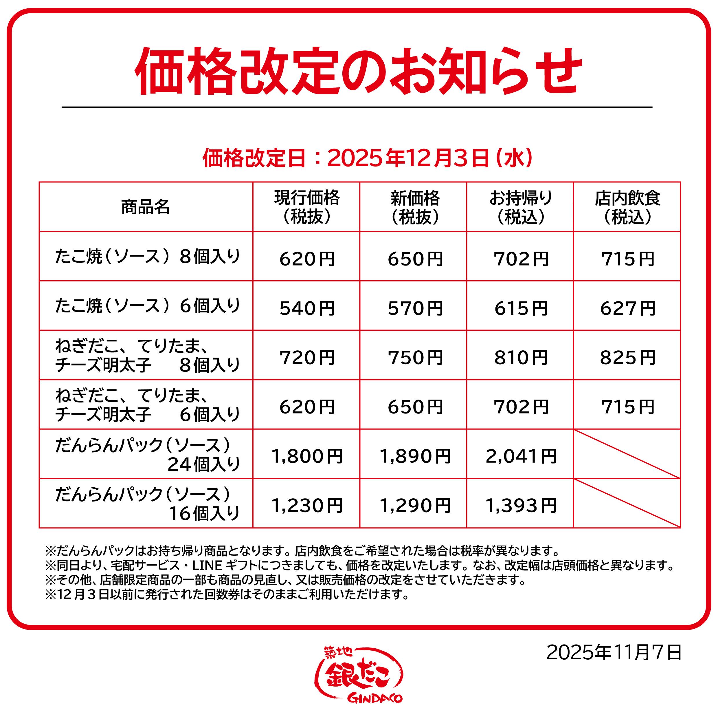 メニュー今すぐ注文お店に行くニュースもっとたのしく!こだわり・ヒミツメニュー今すぐ注文お店に行くニュースもっとたのしく!こだわり・ヒミツおトクな情報を配信中!銀だこソーシャルメディア公式アカウントお得なスタンプカードメニュー今すぐ注文お店に行くニュースNewsニュース詳細重要なお知らせ2025.11.06 木価格改定のお知らせお客様各位日頃より築地銀だこをご愛顧いただきまして、誠にありがとうございます。築地銀だこでは、2025年12月3日(水)より商品価格の改定をさせていただきます。昨今の世界情勢など様々な背景による原材料価格の高騰に合わせ、人件費、物流費、光熱費なども上昇し、これらの価格変動を企業努力だけでは吸収することが難しい状況となり、この度、やむを得ず商品価格の改定を行うこととなりました。何卒、皆さまのご理解を賜りますよう、よろしくお願い申し上げます。お知らせ一覧へもどるSHAREお得なスタンプカードデリバリー大口注文 ご相談窓口お得なスタンプカードデリバリー大口注文 ご相談窓口