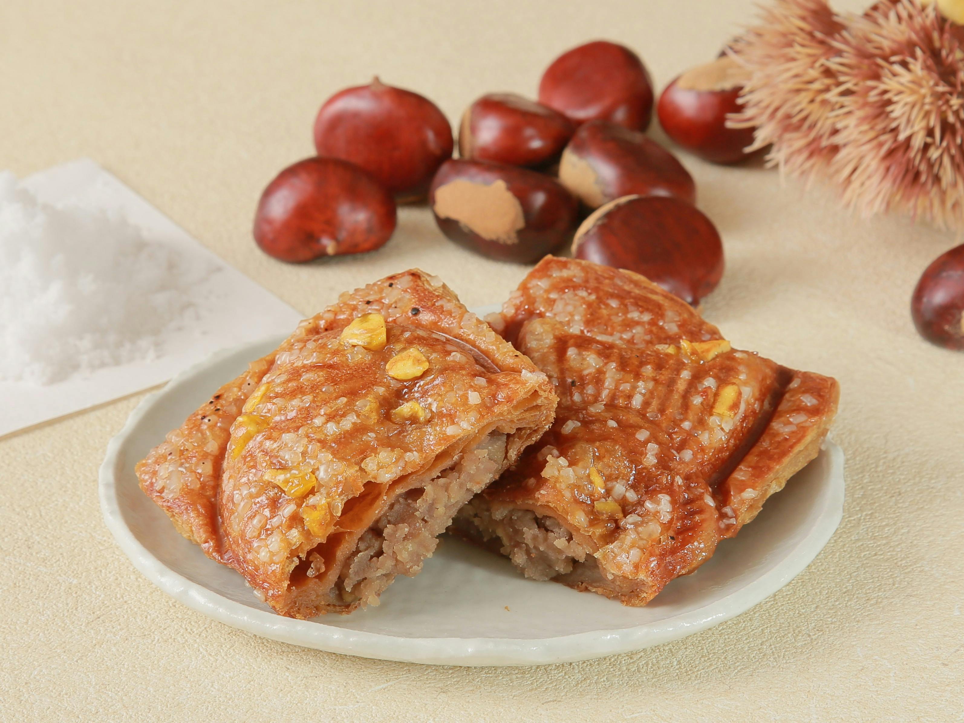 2023年以降、秋の期間限定商品として登場し大好評をいただいたクロワッサンたい焼『塩栗』が、今年はさらに “栗” 感をアップして再登場! 餡の甘さと塩のバランスにこだわり、全体の約4割以上に栗を使用した贅沢な “特製甘栗あん” は、大きめにカットした栗と白あんを合わせることで、栗ならではのホクホクとした食感と、なめらかで優しい甘さを同時にお楽しみいただけます。さらに、マロンペーストを練り込んだオリジナル生地を使用し、表面(片面のみ)に “ザラメ糖” と “岩塩をまぶした蜜漬けの甘栗” をのせ、専用機器で両面から一気に香ばしく焼き上げました。