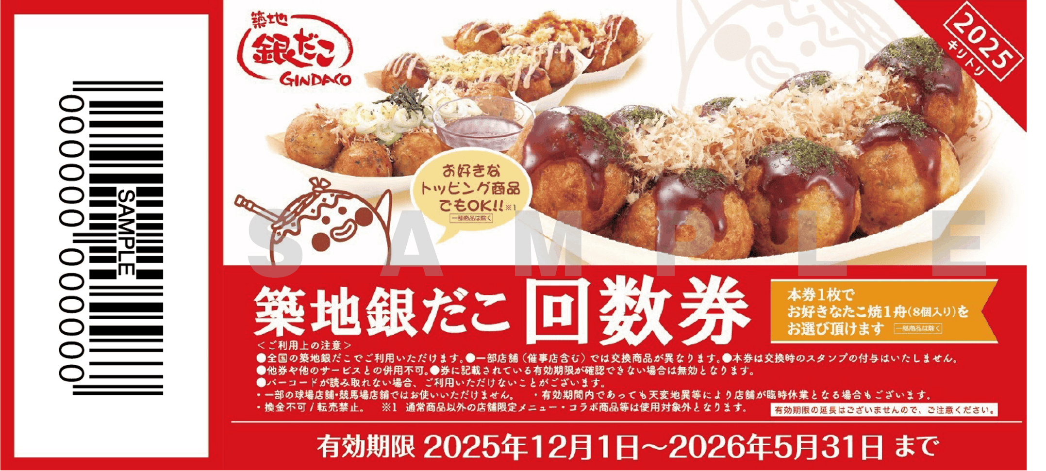 2025年11月18日(火)より、全国の築地銀だこ店舗(一部店舗を除く)にて、『ぜったいお得な回数券』 を、期間・数量限定で発売いたします!