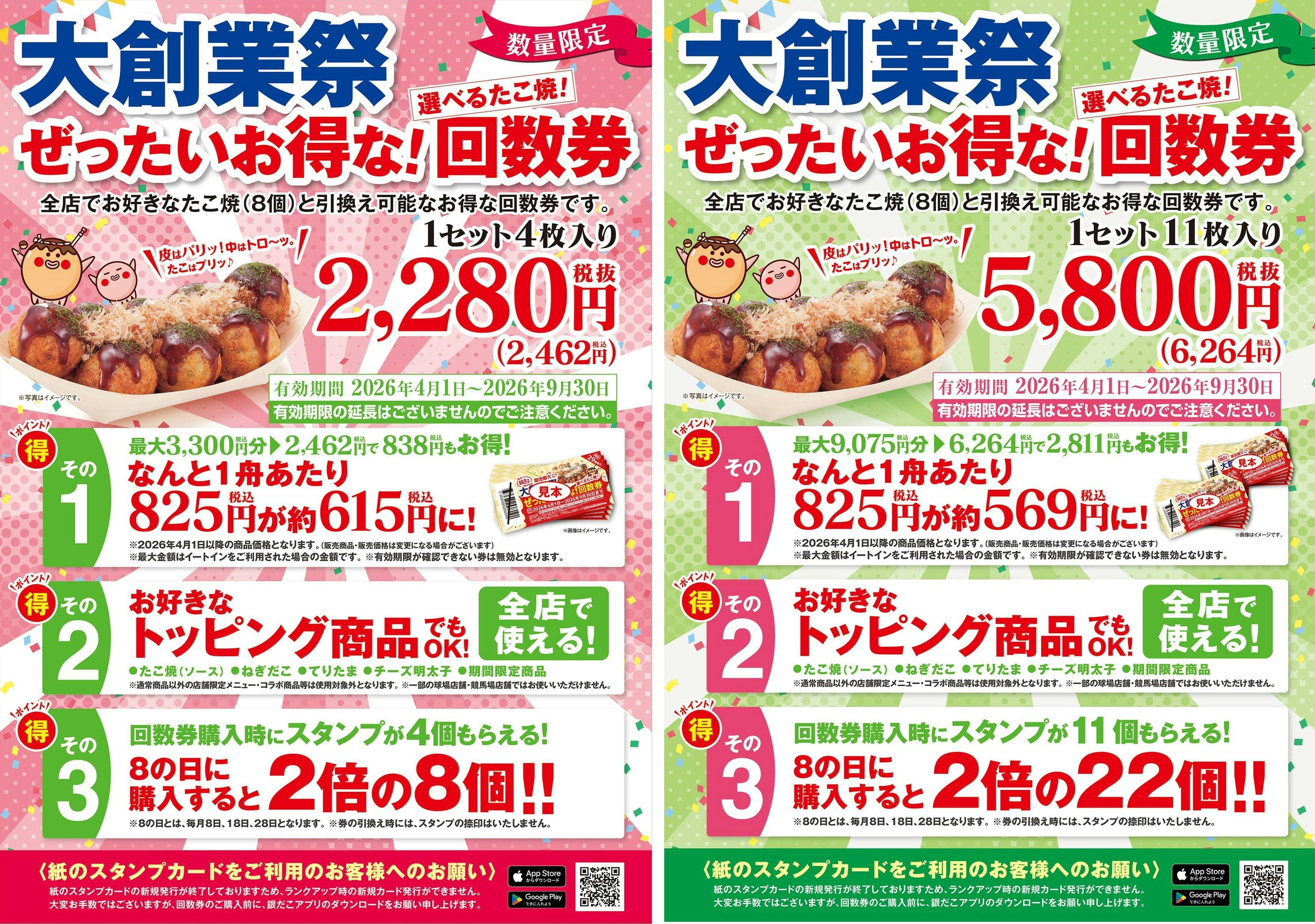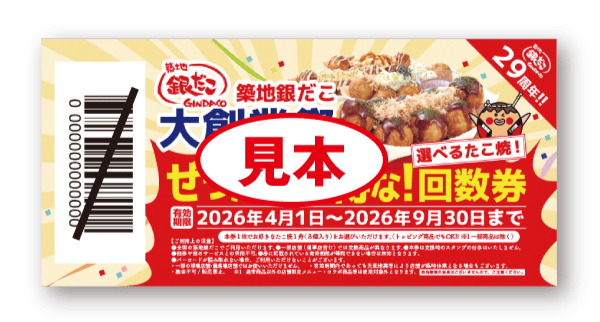 大創業祭期間中の 2026年3月7日(土)より、全国の築地銀だこ店舗(一部店舗を除く)にて、毎回大好評で売切れ必至の 『ぜったいお得な!回数券』 を期間・数量限定で発売いたします!