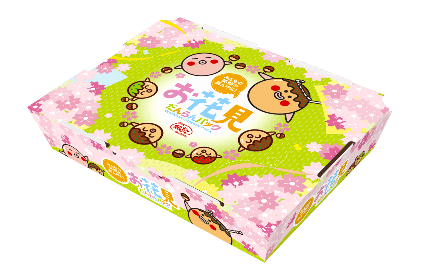 今年の 『お花見だんらんパック』 は、満開の桜の下、築地銀だこマスコットキャラクター「たこぼ~」たちが輪になって仲良くたこ焼パーティーを楽しむ様子を描いた、オリジナルデザインです。箱いっぱいに広がる桜の淡いピンクをベースに、春の訪れの喜びと、だんらんの楽しさを “ぎゅっ” と詰め込んだ、思わず笑顔がこぼれるようなパッケージに仕上げました。