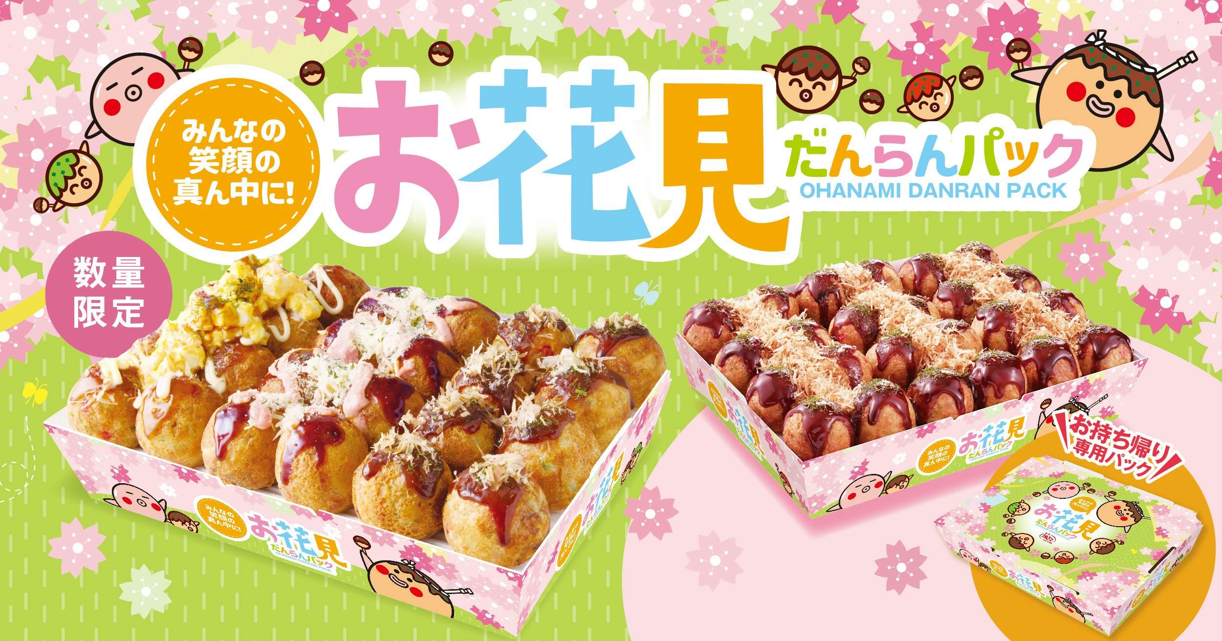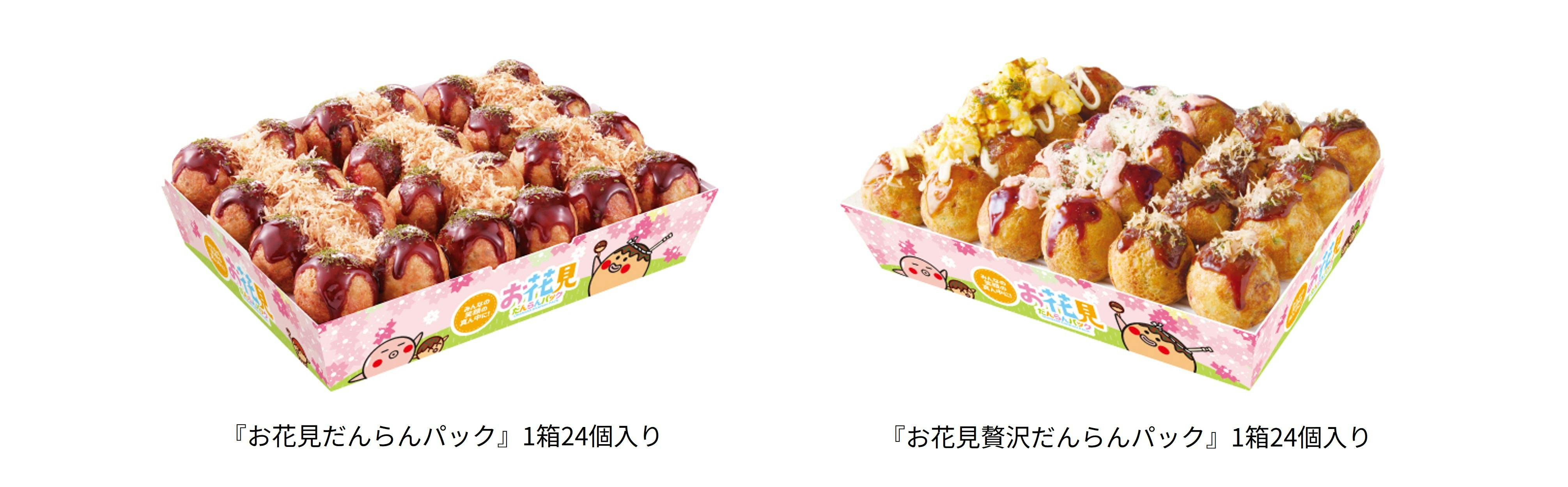 「だんらんパック」 はお持ち帰り専用商品としてご用意しており、『お花見だんらんパック』 は、1番人気の「ぜったいうまい‼たこ焼(ソース)」のみでご提供。『お花見贅沢だんらんパック』は、「ぜったいうまい‼たこ焼(ソース)」 に加え、定番商品の 「てりたま」 と 「チーズ明太子」 の3種類をお楽しみいただけます。いずれも単品でのご購入と比べて “60円” お得なセット価格でご提供いたします。