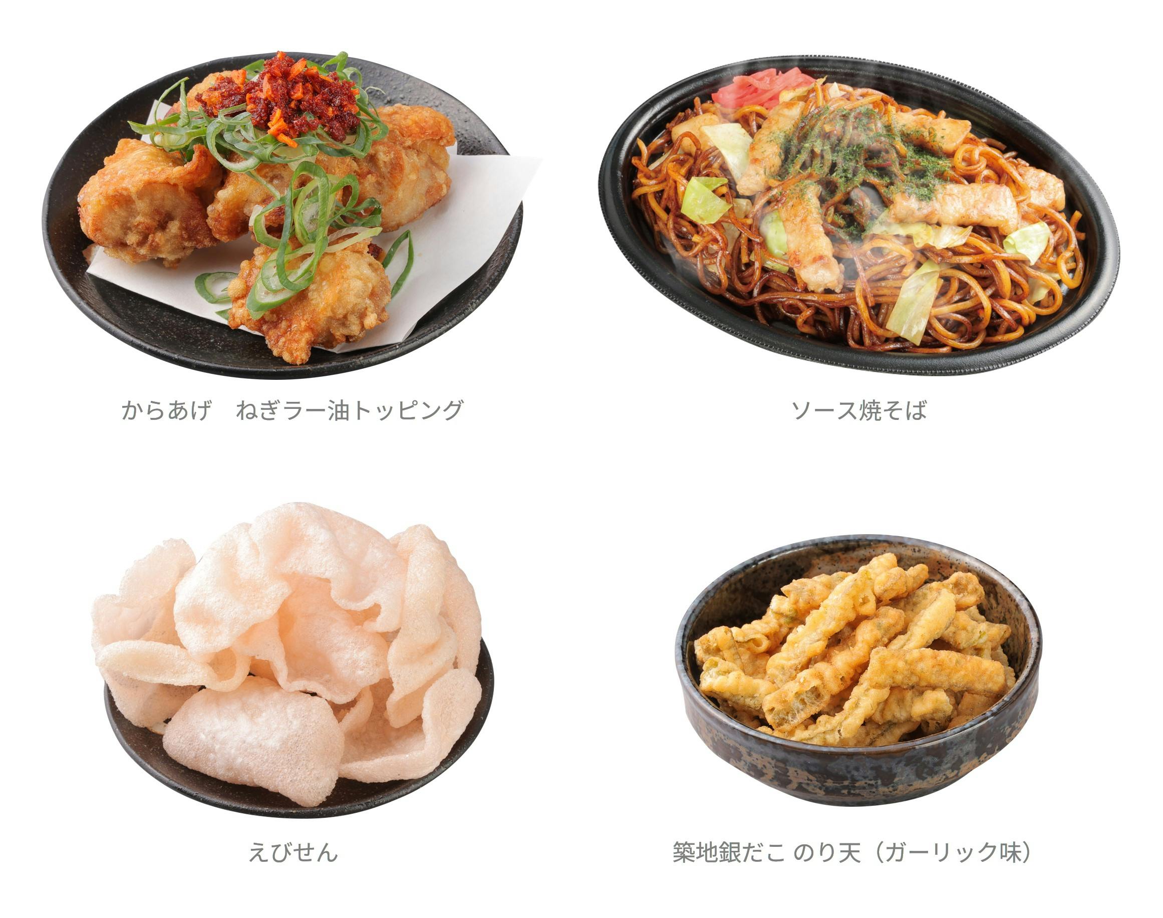 今回、たこ焼以外にも焼そばやおつまみメニューもご用意しました!衣は薄くカリッとジューシーな口あたりの「からあげ」、ねぎと食べるラー油をトッピングした「からあげ ねぎラー油」は、味変をお楽しみいただけます。また、おつまみの定番「えびせん」、「銀だこハイボール酒場」でも人気の高いガツンとパンチのあるガーリック風味の「のり天」など、手軽なおつまみも取り揃えておりますので、お好きなアルコールやソフトドリンクと一緒にお召し上がりください!