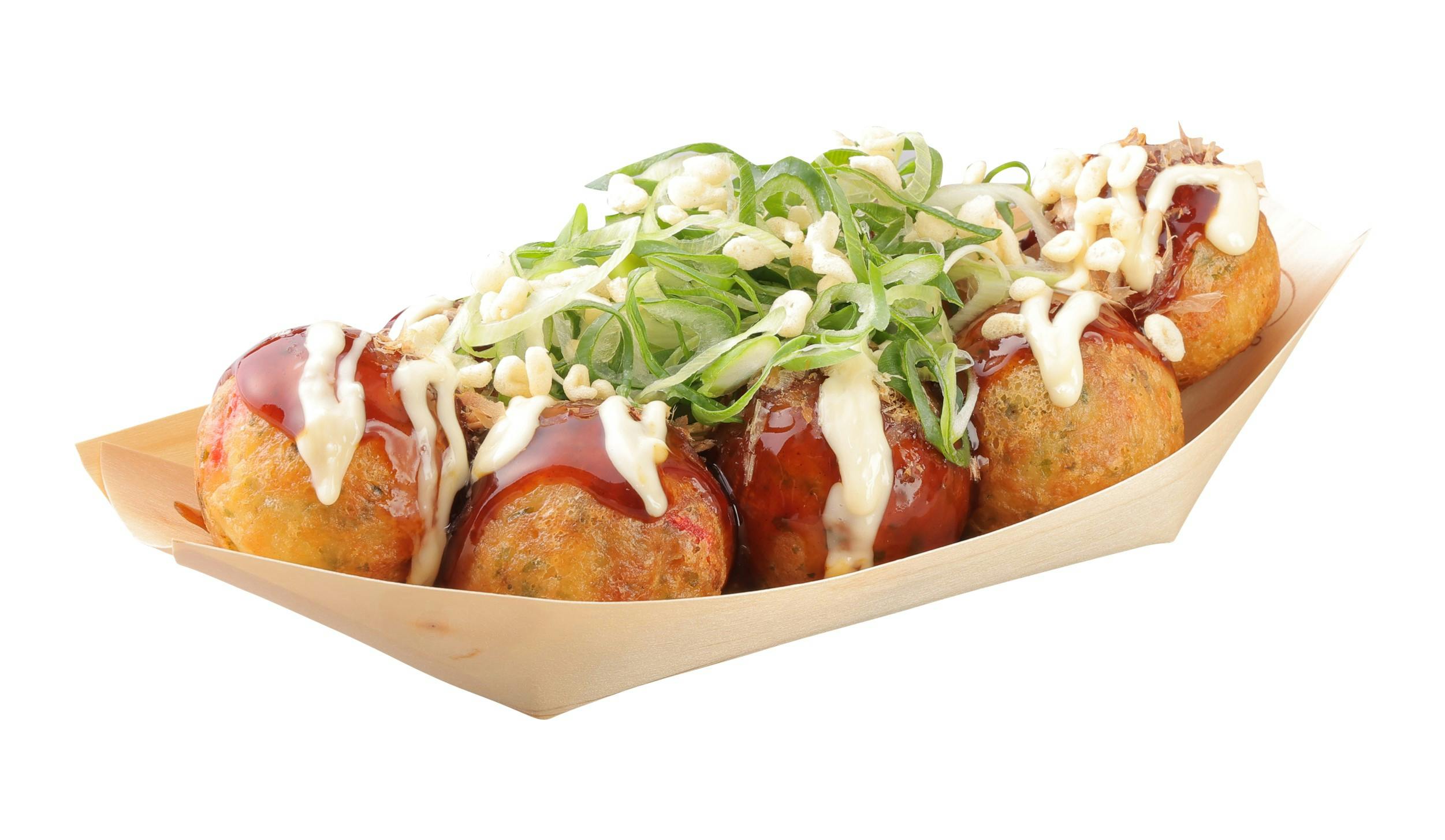 期間限定メニューでも人気の高い商品で、特製の “甘口ソース” と、風味豊かな削り節、マヨネーズをかけ、そこに主役となる “九条ねぎ” を添えました。